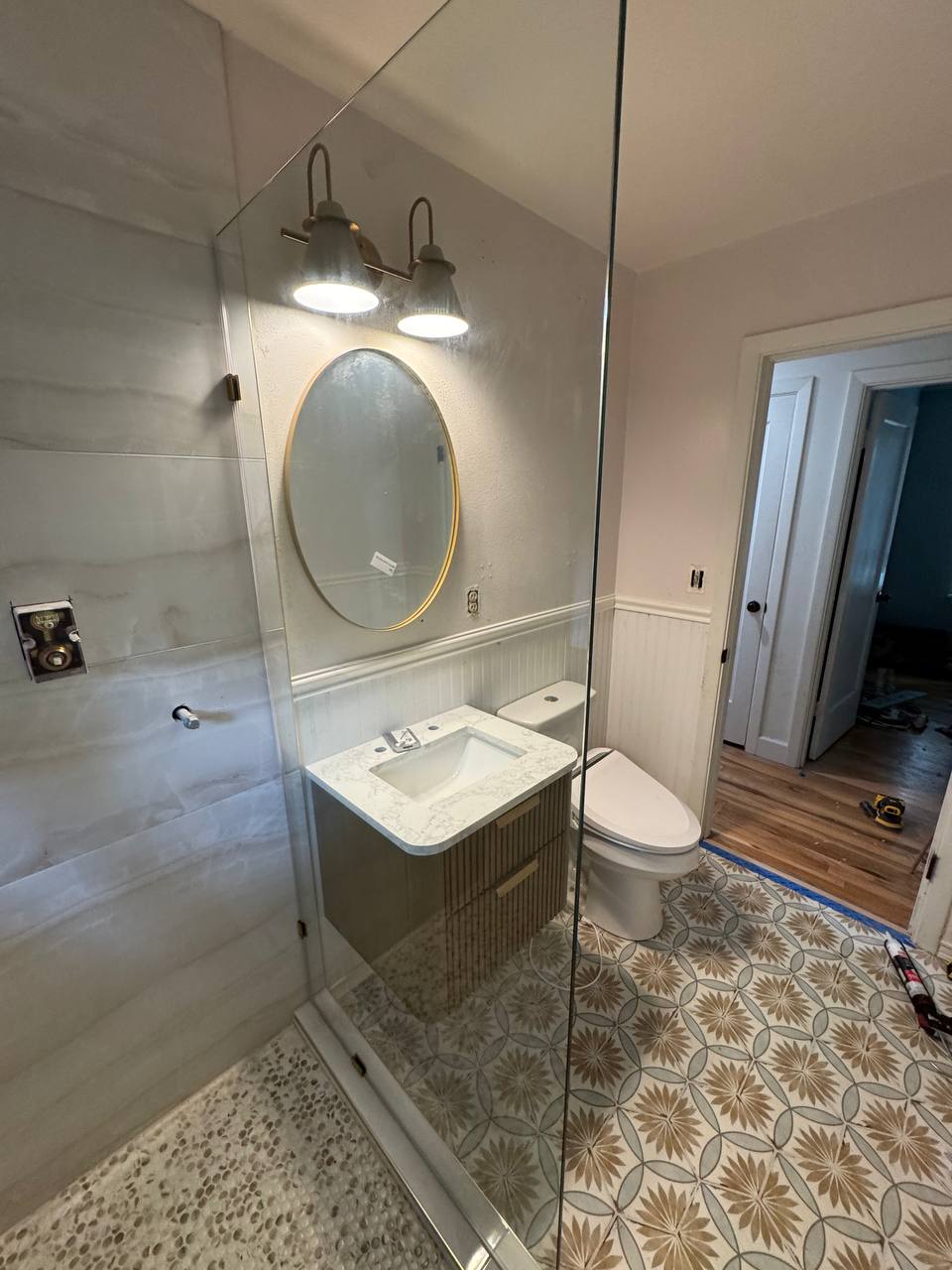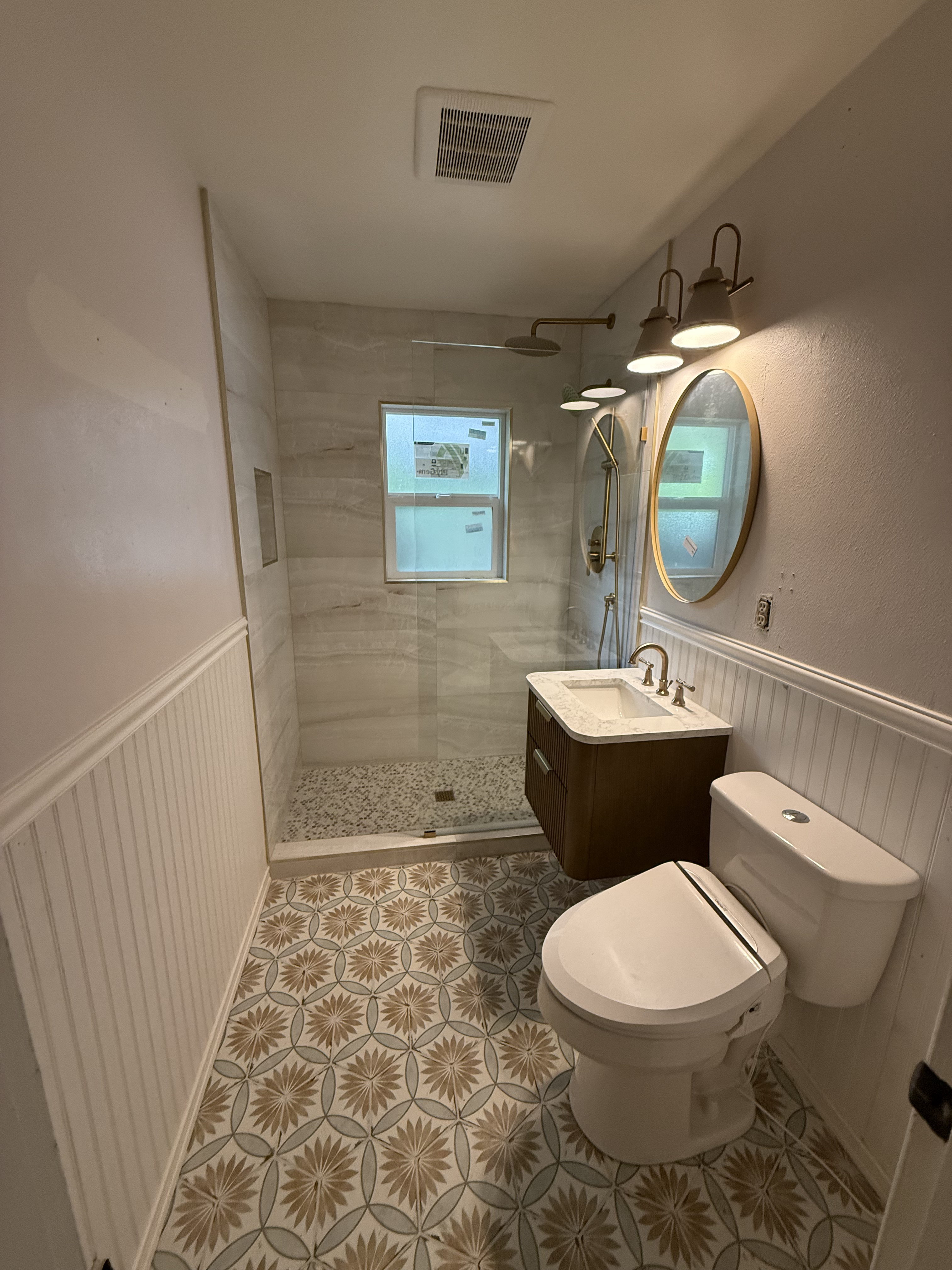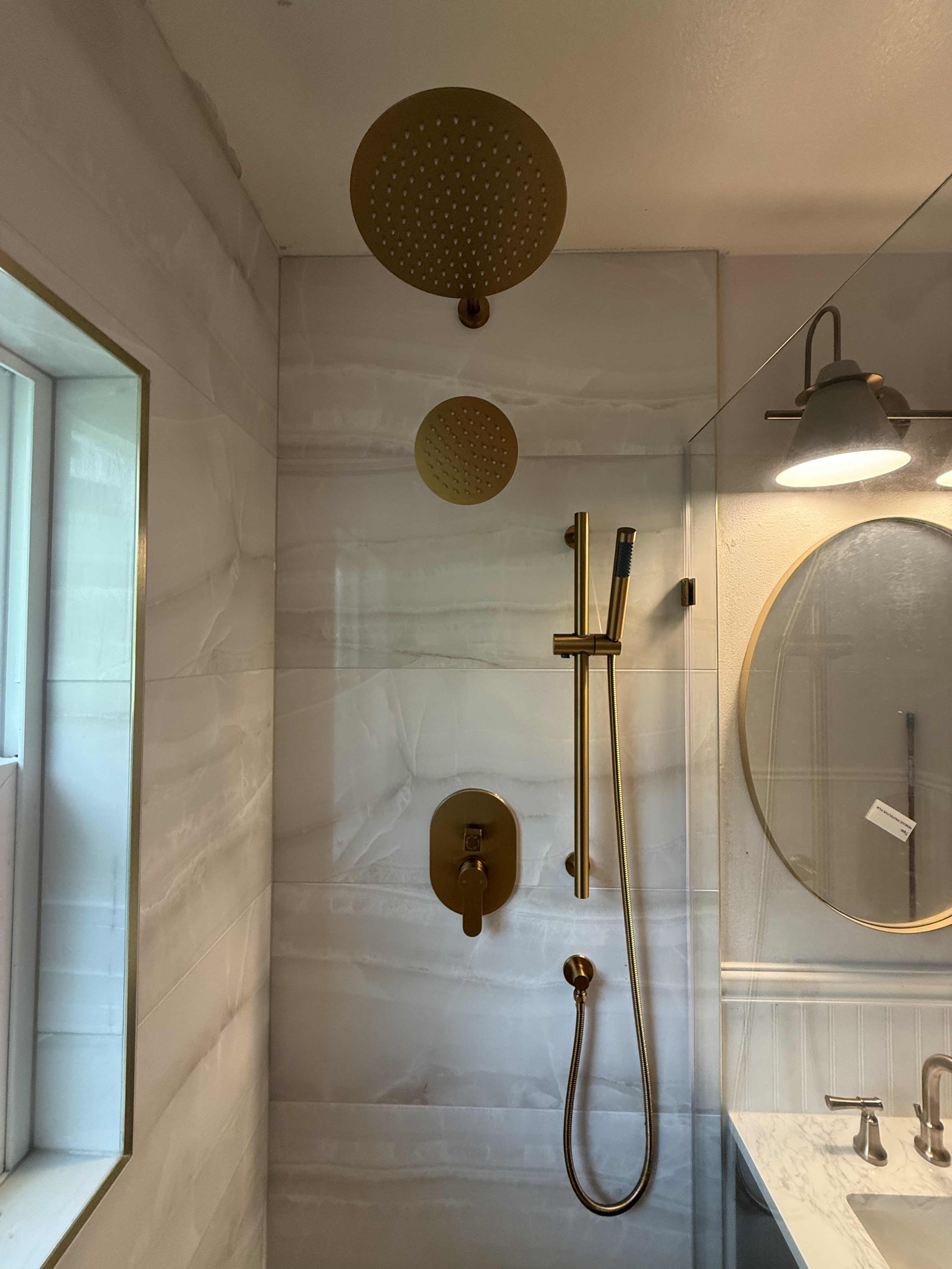 We also modernized the shower system by upgrading the plumbing to a three-way valve setup for everyday comfort and flexibility. This included a wall-mounted rain shower positioned at the top of the wall, a standard fixed shower head above, and a handheld shower wand mounted at chest height. Everything was installed for reliable performance, water efficiency, and smooth operation—delivering a bathroom that looks great and functions even better.