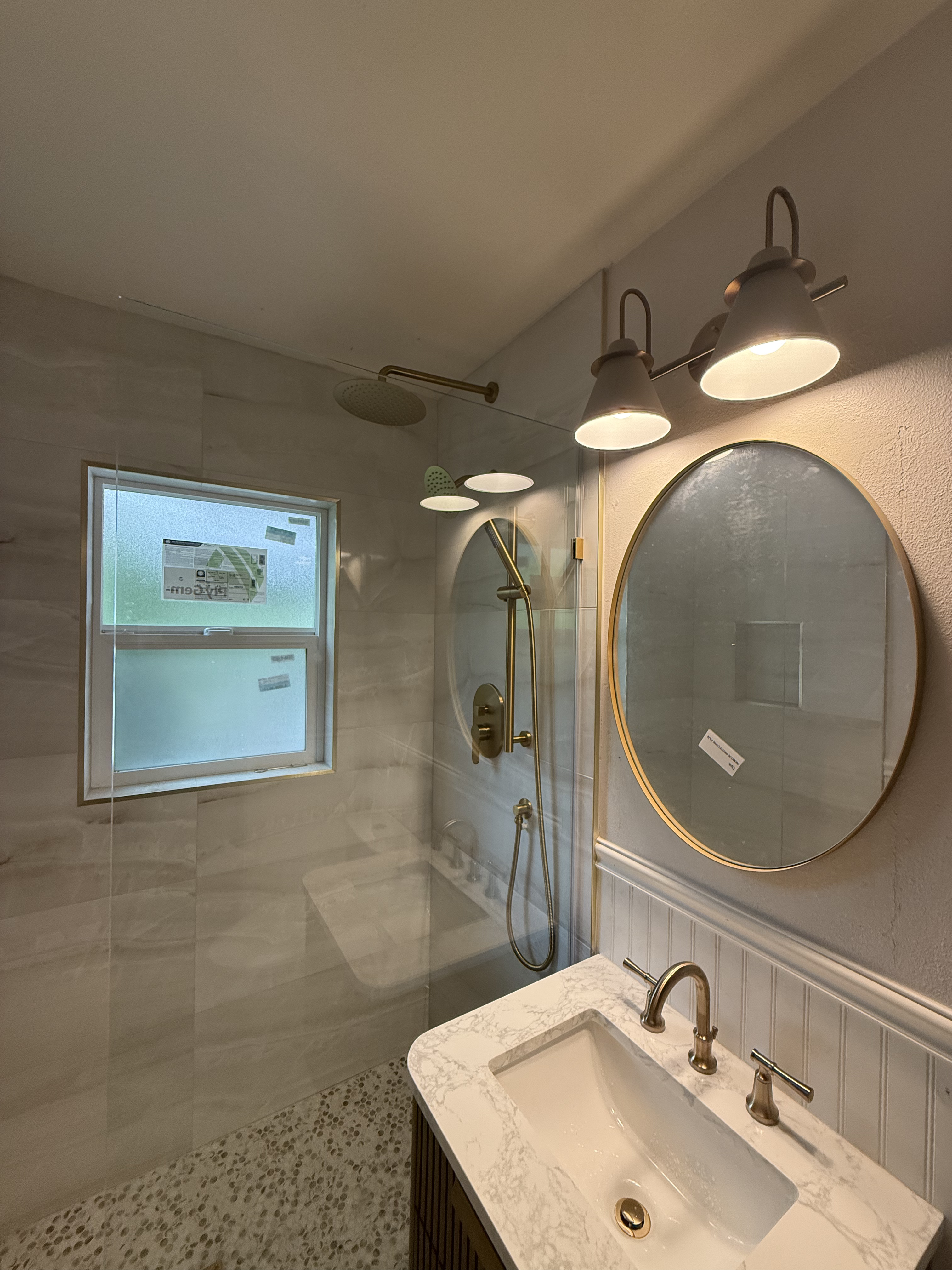 For this residential bathroom renovation in Vancouver, WA, we focused on creating a clean, upgraded look while adding character and long-term durability. We installed decorative wainscoting to bring architectural detail into the space, then finished the shower surround with large-format tile for a modern feel and fewer grout lines—making the walls both sleek and easier to maintain.