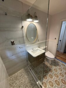 On the flooring side, the bathroom floor was upgraded with hexagon tile for a classic, high-end look, while the shower floor was completed with mosaic tile to support proper drainage and add visual contrast. The result is a cohesive tile design that feels intentional from wall to floor.
