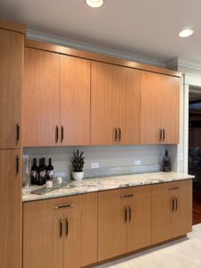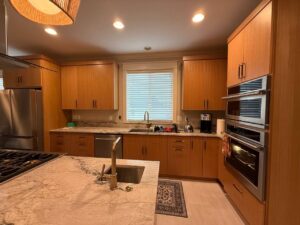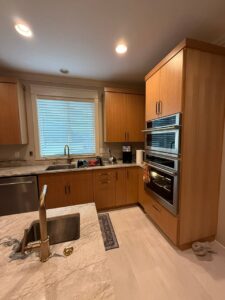 The homeowners wanted a modern kitchen that still felt warm and inviting. They chose light wood kitchen cabinets with white countertops to keep the space bright while adding natural warmth. This remodel keeps the open layout but makes the room more functional for everyday cooking and hosting.